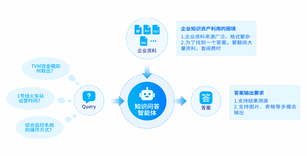 依托大模型構(gòu)建全面的企業(yè)知識(shí)庫(kù),專(zhuān)注于企業(yè)規(guī)章制度、政策文件、工作流程及項(xiàng)目管理等內(nèi)外部資料的精準(zhǔn)智能問(wèn)策服務(wù)。系統(tǒng)支持多輪對(duì)話(huà)交互,實(shí)現(xiàn)信息溯源與深度學(xué)習(xí),功能覆蓋知識(shí)問(wèn)答、垂直搜索及文本自動(dòng)化生成,為用戶(hù)提供專(zhuān)業(yè)、高效且個(gè)性化的知識(shí)處理與決策輔助。